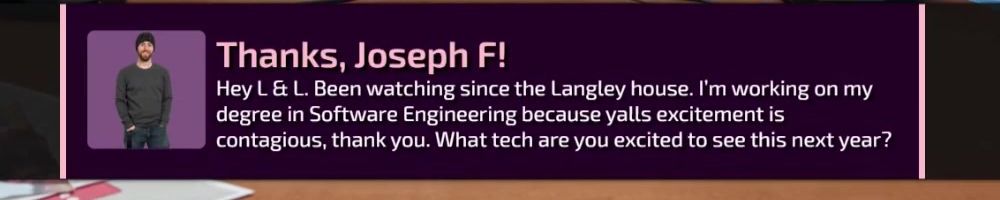 Hey L & L. Been watching since the Langley house. I'm working on my degree in Software Engineering because yalls excitement is contagious, thank you. What tech are you excited to see this next year?