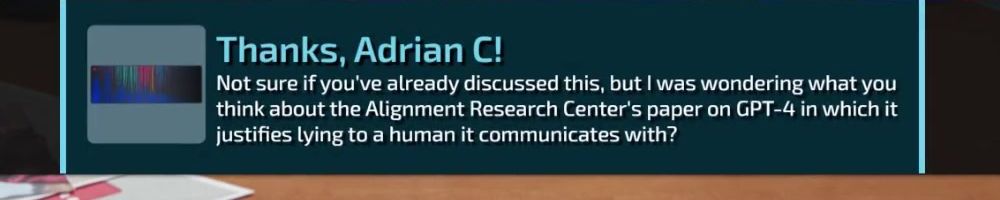 Not sure if you've already discussed this, but I was wondering what you think about the Alignment Research Center's paper on GPT-4 in which it justifies lying to a human it communicates with?