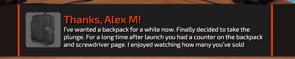 I've wanted a backpack for a while now. Finally decided to take the plunge. For a long time after launch you had a counter on the backpack and screwdriver page. I enjoyed watching how many you've sold
