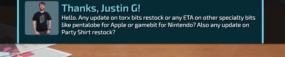 Hello. Any update on torx bits restock or any ETA on other specialty bits like pentalobe for Apple or gamebit for Nintendo? Also any update on Party Shirt restock?