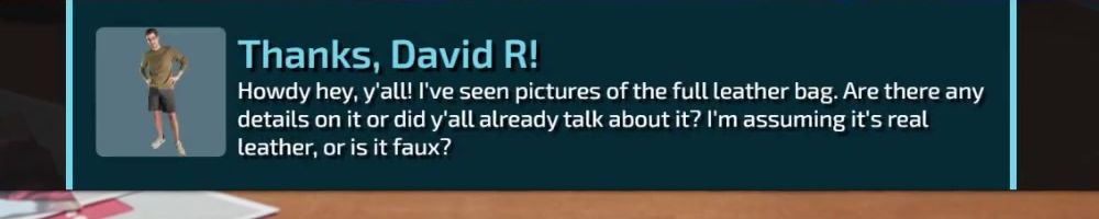 Howdy hey, y'all! I've seen pictures of the full leather bag. Are there any details on it or did y'all already talk about it? I'm assuming it's real leather, or is it faux?