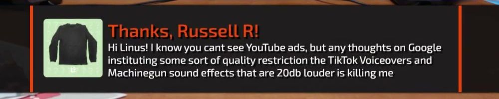 Hi Linus! I know you cant see YouTube ads, but any thoughts on Google instituting some sort of quality restriction the TikTok Voiceovers and Machinegun sound effects that are 20db louder is killing me