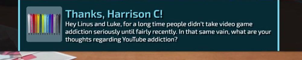 Hey Linus and Luke, for a long time people didn't take video game addiction seriously until fairly recently. In that same vain, what are your thoughts regarding YouTube addiction?