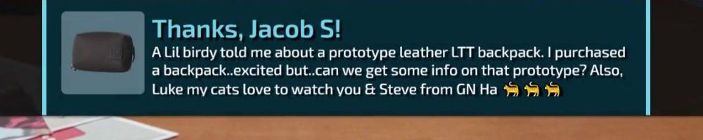 A Lil birdy told me about a prototype leather LTT backpack. I purchased a backpack..excited but..can we get some info on that prototype? Also, Luke my cats love to watch you & Steve from GN Ha 🐊🐊🐊
