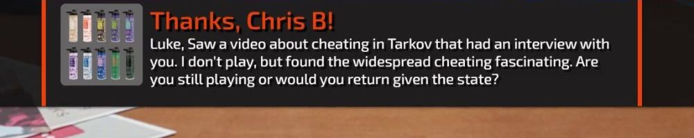 Luke, Saw a video about cheating in Tarkov that had an interview with you. I don't play, but found the widespread cheating fascinating. Are you still playing or would you return given the state?
