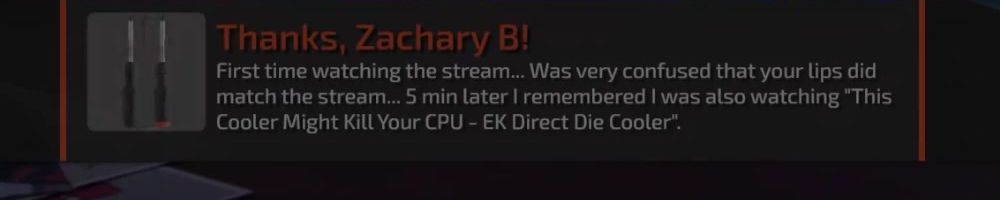 First time watching the stream... Was very confused that your lips did match the stream... 5 min later I remembered I was also watching "This Cooler Might Kill Your CPU - EK Direct Die Cooler".