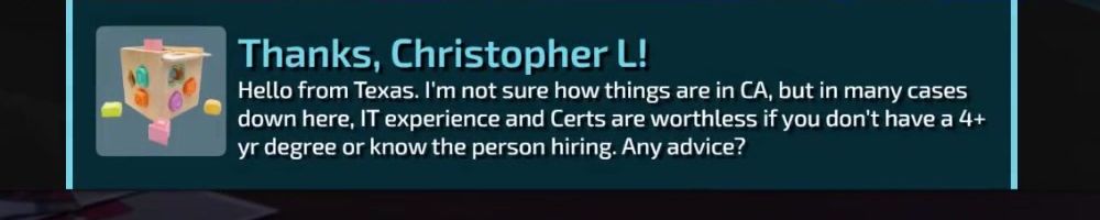 Hello from Texas. I'm not sure how things are in CA, but in many cases down here, IT experience and Certs are worthless if you don't have a 4+ yr degree or know the person hiring. Any advice?