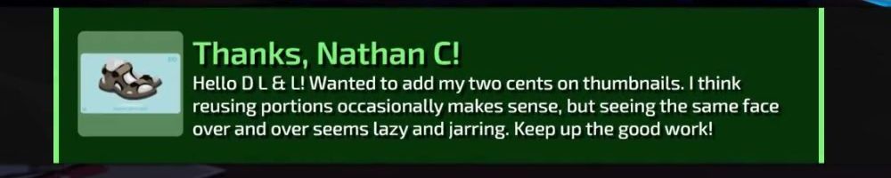 Hello D L & L! Wanted to add my two cents on thumbnails. I think reusing portions occasionally makes sense, but seeing the same face over and over seems lazy and jarring. Keep up the good work!