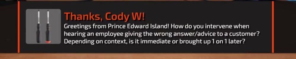 Greetings from Prince Edward Island! How do you intervene when hearing an employee giving the wrong answer/advice to a customer? Depending on context, is it immediate or brought up 1on1 later?