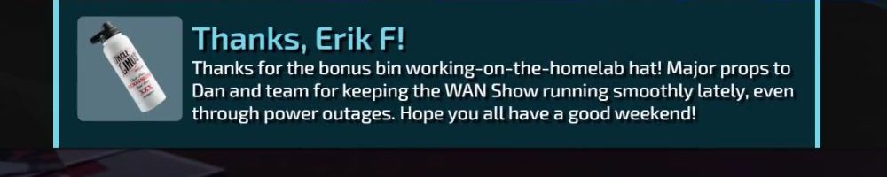 Thanks for the bonus bin working-on-the-homelab hat! Major props to Dan and team for keeping the WAN Show running smoothly lately, even through power outages. Hope you all have a good weekend!