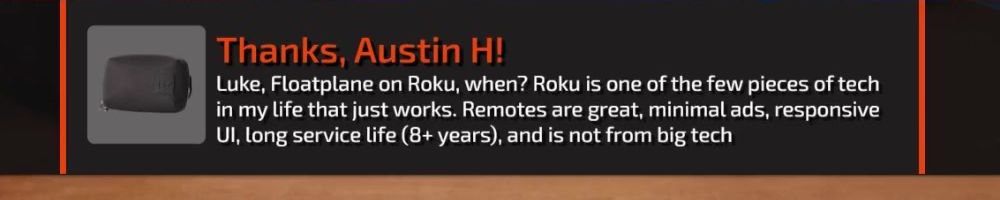 Luke, Floatplane on Roku, when? Roku is one of the few pieces of tech in my life that just works. Remotes are great, minimal ads, responsive UI, long service life (8+ years), and is not from big tech