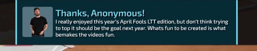I really enjoyed this year's April Fools LTT edition, but don't think trying