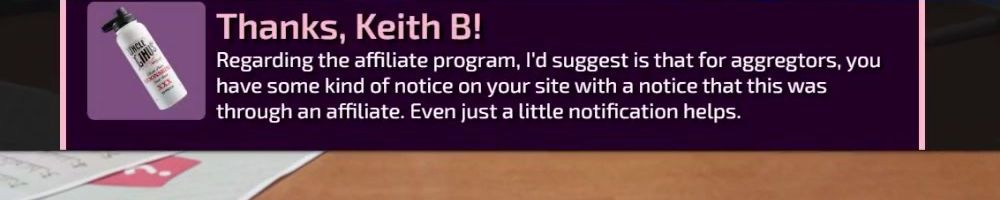 Regarding the affiliate program, I'd suggest is that for aggregtors, you have some kind of notice on your site with a notice that this was through an affiliate. Even just a little notification helps.