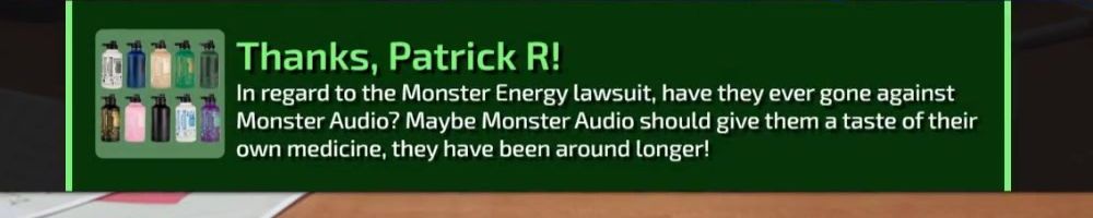 In regard to the Monster Energy lawsuit, have they ever gone against Monster Audio? Maybe Monster Audio should give them a taste of their own medicine, they have been around longer!