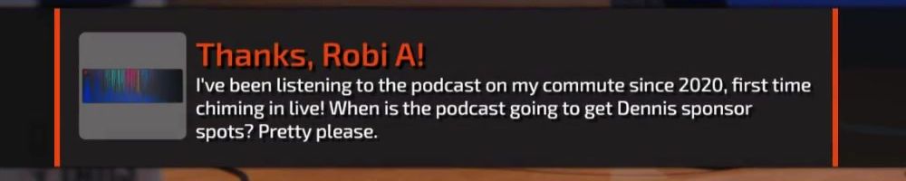 I've been listening to the podcast on my commute since 2020, first time chiming in live! When is the podcast going to get Dennis sponsor spots? Pretty please.