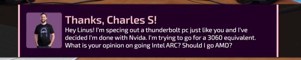 Hey Linus! I'm specing out a thunderbolt pc just like you and I've decided I'm done with Nvida. I'm trying to go for a 3060 equivalent. What is your opinion on going Intel ARC? Should I go AMD?