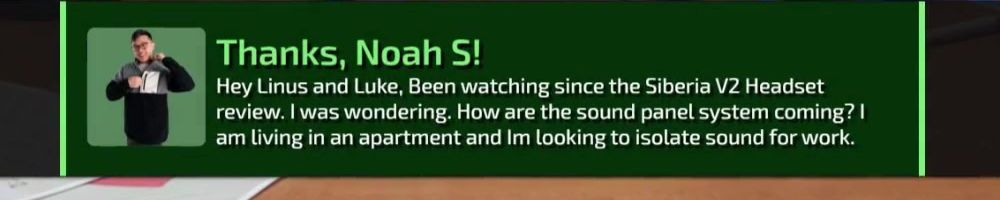 Hey Linus and Luke, Been watching since the Siberia V2 Headset review. I was wondering. How are the sound panel system coming? I am living in an apartment and Im looking to isolate sound for work.