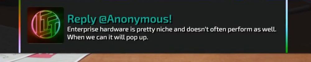 Linus, have you considered doing videos on enterprise storage? Pure, Dell Powerstore, Nimble, etc. Would love to see you guys dive into more enterprise hardware. Thanks!