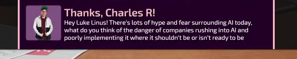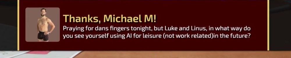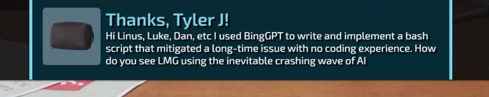 Hi Linus, Luke, Dan, etc I used BingGPT to write and implement a bash script that mitigated a long-time issue with no coding experience. How do you see LMG using the inevitable crashing wave of AI