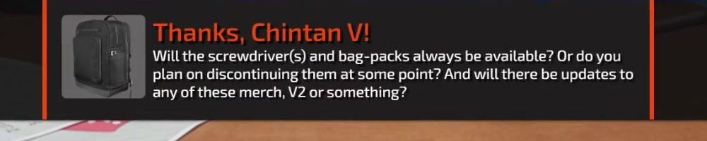 Will the screwdriver(s) and bag-packs always be available? Or do you plan on discontinuing them at some point? And will there be updates to any of these merch, V2 or something?