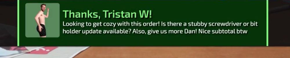 Hey Luke, Linus and Dan (and Kyle): Loving the screwdriver and I'm picking another up for a buddy's wedding registry. Any news on what the timeline is for the shorty screwdriver?