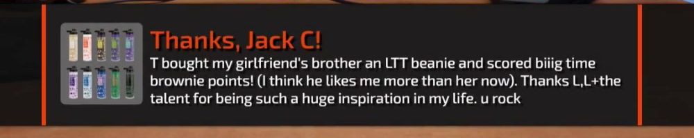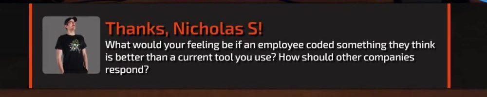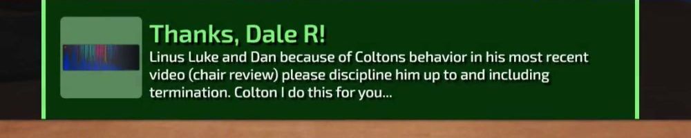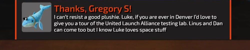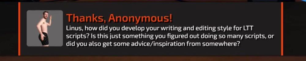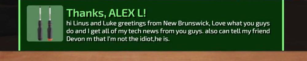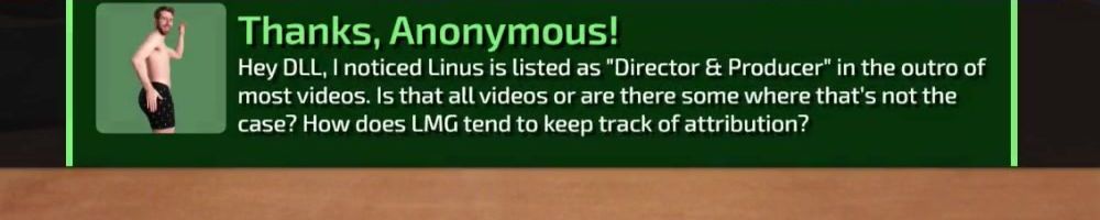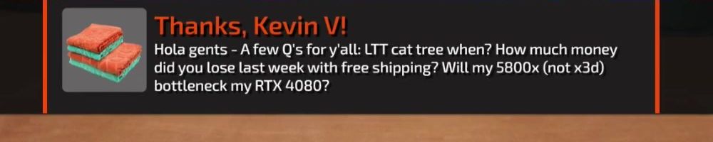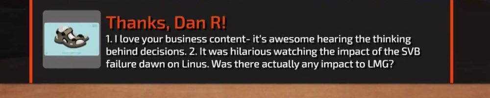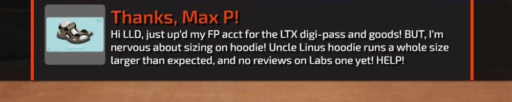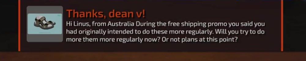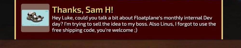 Thanks, Sam H! Hey Luke, could you talk a bit about Floatplane's monthly internal Dev day? I'm trying to sell the idea to my boss. Also Linus, I forgot to use the free shipping code, you're welcome ;)