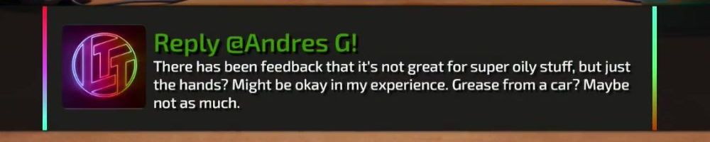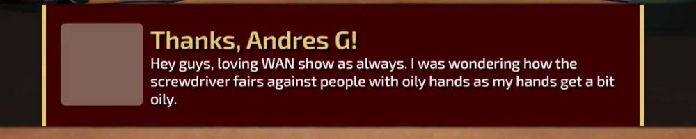 Thanks, Andres G! Hey guys, loving WAN show as always. I was wondering how the screwdriver fairs against people with oily hands as my hands get a bit oily.