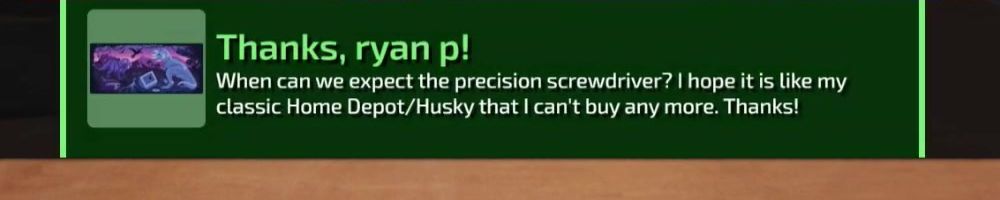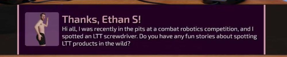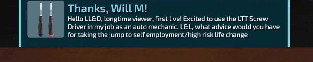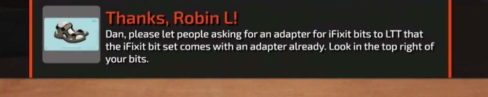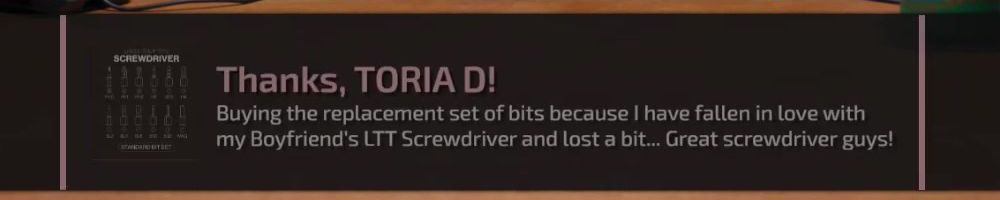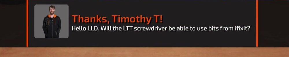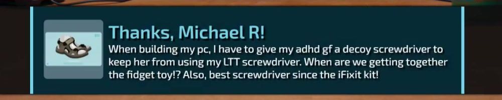 Thanks, Michael R! When building my pc, I have to give my adhd gf a decoy screwdriver to keep her from using my LTT screwdriver. When are we getting together the fidget toy!? Also, best screwdriver since the iFixit kit!