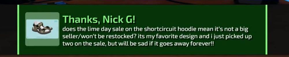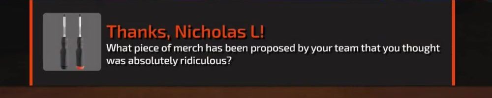 Thanks, Nicholas L! What piece of merch has been proposed by your team that you thought was absolutely ridiculous?