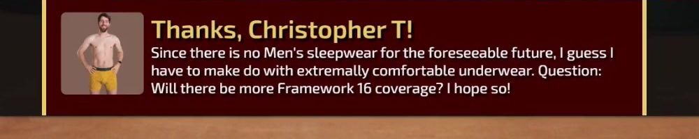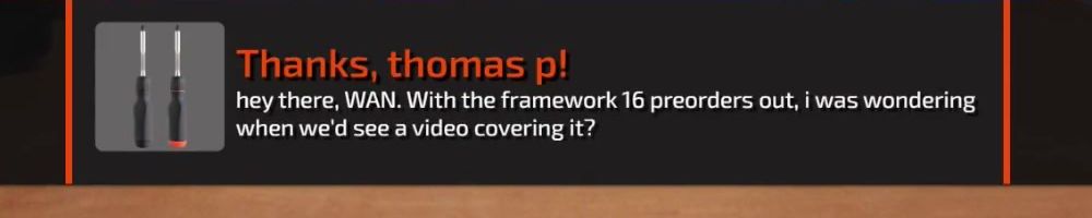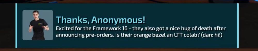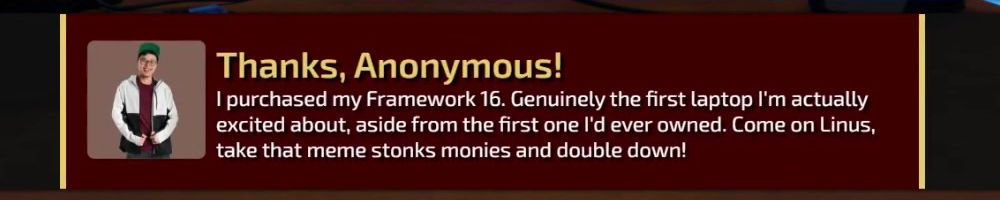 Thanks, Anonymous! I purchased my Framework 16. Genuinely the first laptop I'm actually excited about, aside from the first one I'd ever owned. Come on Linus, take that meme stonks monies and double down!