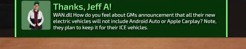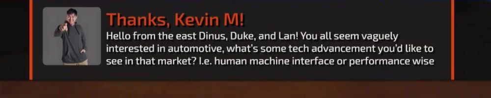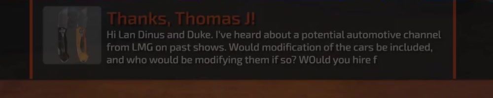 Thanks, Thomas J! Hi Lan Dinus and Duke. I've heard about a potential automotive channel from LMG on past shows. Would modification of the cars be included, and who would be modifying them if so? Would you hire f