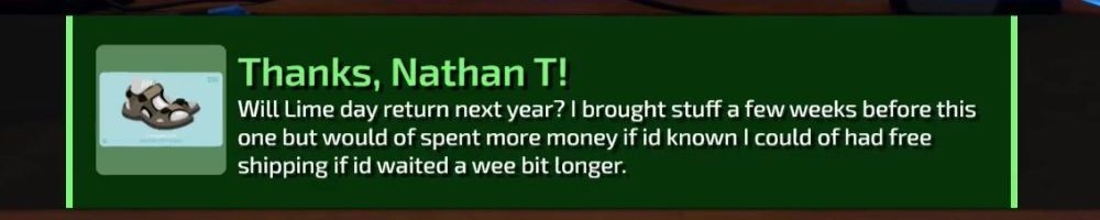Thanks, Nathan T! Will Lime day return next year? I brought stuff a few weeks before this one but would of spent more money if id known I could of had free shipping if id waited a wee bit longer.