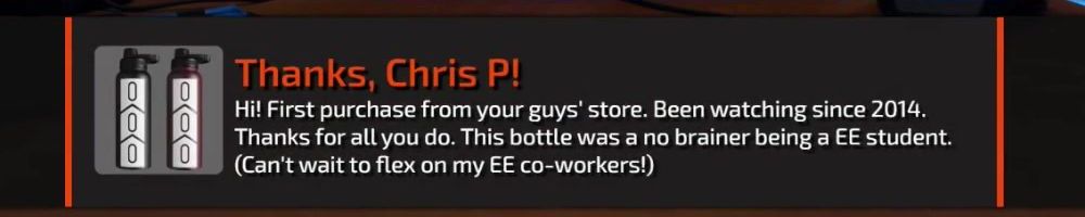 Thanks, Chris P! Hi! First purchase from your guys' store. Been watching since 2014. Thanks for all you do. This bottle was a no brainer being a EE student. (Can't wait to flex on my EE co-workers!)