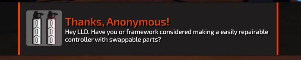 Thanks, Anonymous! Hey LLD. Have you or framework considered making a easily repairable controller with swappable parts?