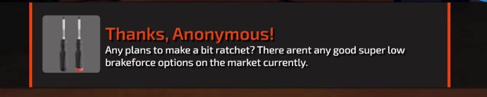 Thanks, Anonymous! Any plans to make a bit ratchet? There arent any good super low brakeforce options on the market currently.