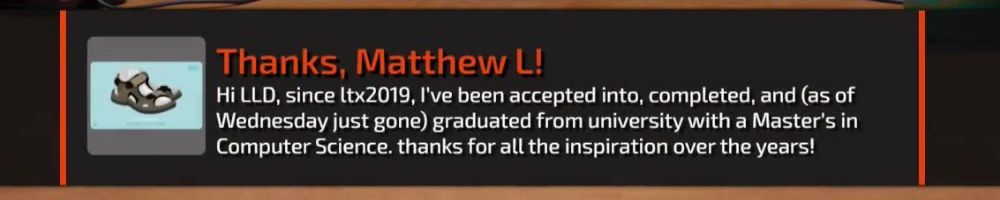 Thanks, Matthew L! Hi LLD, since Ltx2019, I've been accepted into, completed, and (as of Wednesday just gone) graduated from university with a Master's in Computer Science. thanks for all the inspiration over the years!