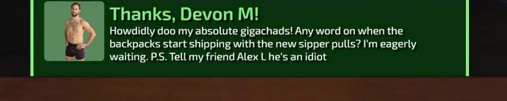 Thanks, Devon M! Howdidly doo my absolute gigachads! Any word on when the backpacks start shipping with the new sipper pulls? I'm eagerly waiting. P.S. Tell my friend Alex L he's an idiot