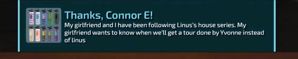 Thanks, Connor E! My girlfriend and I have been following Linus's house series. My girlfriend wants to know when we'll get a tour done by Yvonne instead of linus