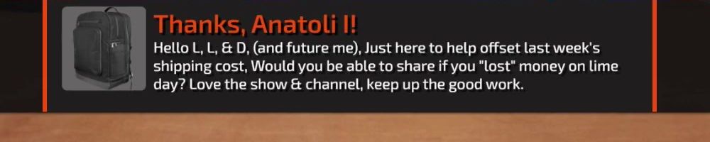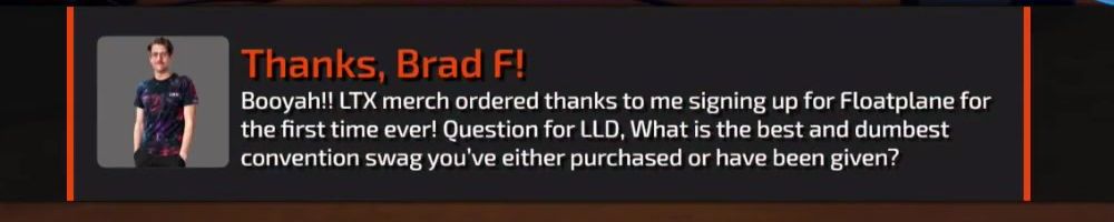 Thanks, Brad F! Booyah!! LTX merch ordered thanks to me signing up for Floatplane for the first time ever! Question for LLD, What is the best and dumbest convention swag you've either purchased or have been given?