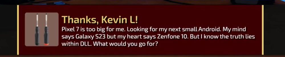 Thanks, Kevin L! Pixel 7 is too big for me. Looking for my next small Android. My mind says Galaxy 523 but my heart says Zenfone 10. But I know the truth lies within DLL. What would you go for?