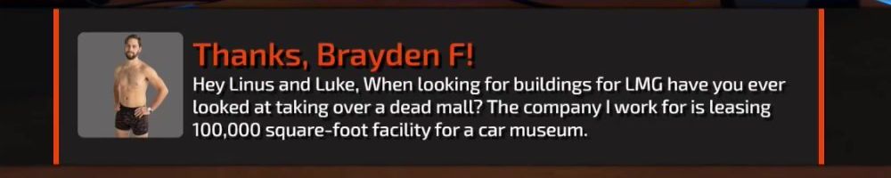 Thanks, Brayden F! Hey Linus and Luke, When looking for buildings for LMG have you ever looked at taking over a dead mall? The company I work for is leasing 100,000 square-foot facility for a car museum.