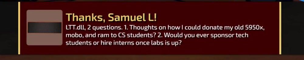 Thanks, Samuel L! LTT.dll, 2 questions. 1. Thoughts on how I could donate my old 5950x, mobo, and ram to CS students? 2. Would you ever sponsor tech students or hire interns once labs is up?