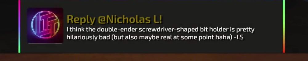 Reply @Nicholas L! I think the double-ender screwdriver-shaped bit holder is pretty hilarously bad (but also maybe real at some point haha) -LS