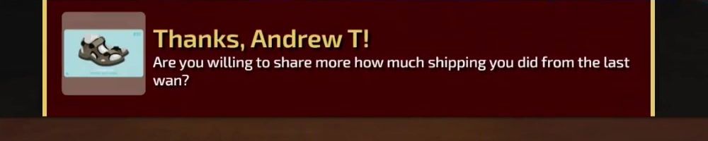 Thanks, Andrew T! Are you willing to share more how much shipping you did from the last wan?