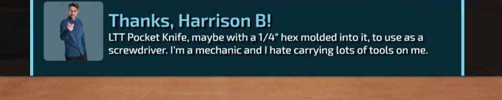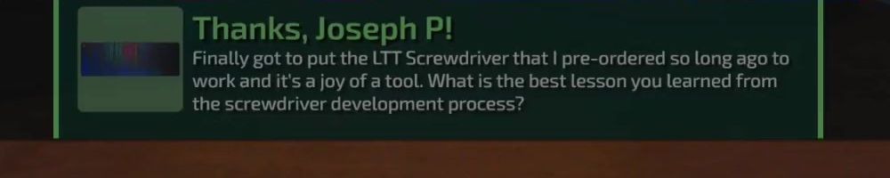 Thanks, Joseph P! Finally got to put the LTT Screwdriver that I pre-ordered so long ago to work and it's a joy of a tool. What is the best lesson you learned from the screwdriver development process?