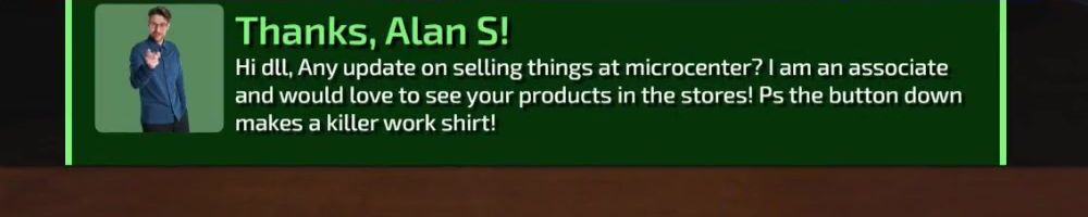 Thanks, Alan S! Hi dll, Any update on selling things at microcenter? I am an associate and would love to see your products in the stores! Ps the button down makes a killer work shirt!