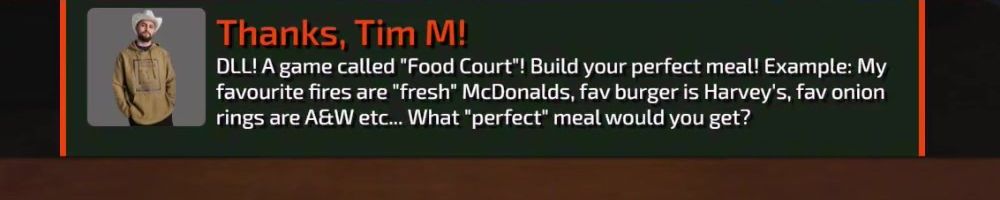 Thanks, Tim M! DLL! A game called "Food Court"! Build your perfect meal! Example: My favourite fires are "fresh" McDonalds, fav burger is Harvey's, fav onion rings are A&W etc... What "perfect" meal would you get?