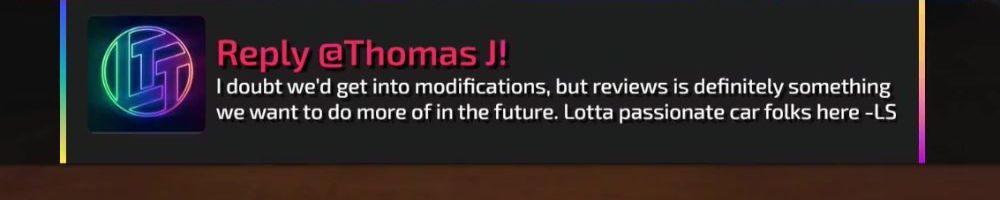 Reply @Thomas J! I doubt we'd get into modifications, but reviews is definitely something we want to do more of in the future. Lotta passionate car folks here -LS