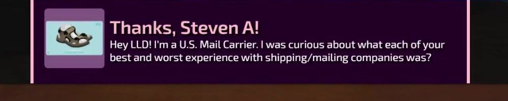 Thanks, Steven A! Hey LLD! I'm a U.S. Mail Carrier. I was curious about what each of your best and worst experience with shipping/mailing companies was?