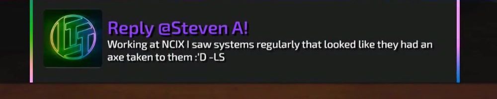 Reply @Steven A! Working at NCIX I saw systems regularly that looked like they had an axe taken to them :’D -LS